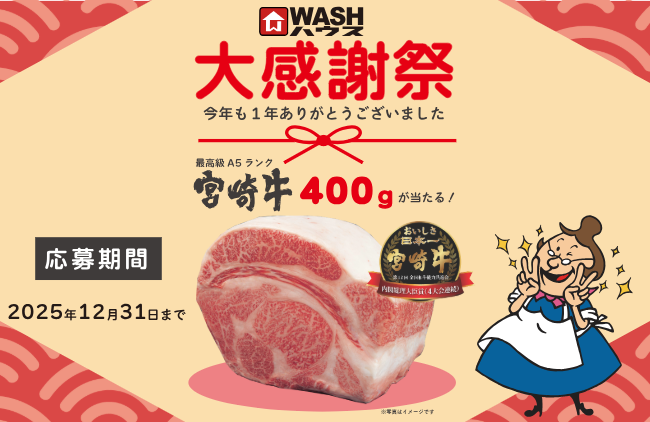 『WASH HOUSE Year-End Thanksgiving Festival』 campaign is underway, with 200 lucky winners winning 400g of Miyazaki beef!